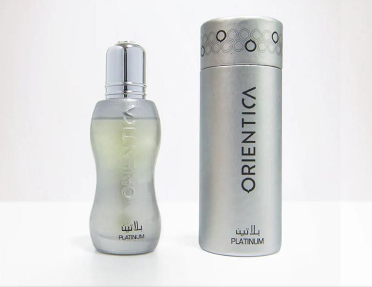 - Aesthetic: The packaging reflects the name with a modern, sleek, silver design. The text on the bottle and box is in both English (“PLATINUM”, “ORIENTICA”) and Arabic script (“بلاتين”).